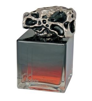 Флакон правильной кубической формы выполнен из толстого стекла, низ которого имеет окрас зарева, постепенно переходящего в непрозрачность сумеречной тайны. Этот «пьедестал» венчает стилизованная под источенный волнами камень металлическая крышка, довершая образ.